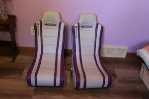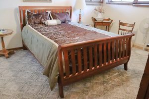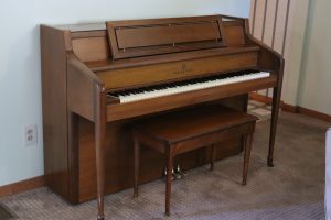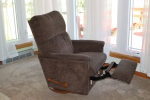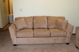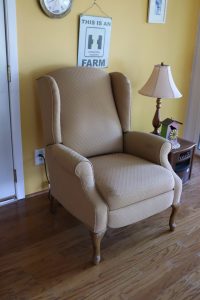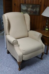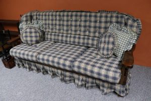 - Very nice selection of modern furniture to include Keller full size walnut sleigh bed & matching dresser; La Z Boy rocker recliners; Winged back recliners; La Z Boy faux leather sofa & matching chair w/ottoman; MCM blue plaid sofa & matching chair; coffee and end tables; oak claw foot dining table & 6 chairs; entry bench; decorative heaters; hall tree; Story & Clark upright piano, students desk; table & floor lamps, etc.